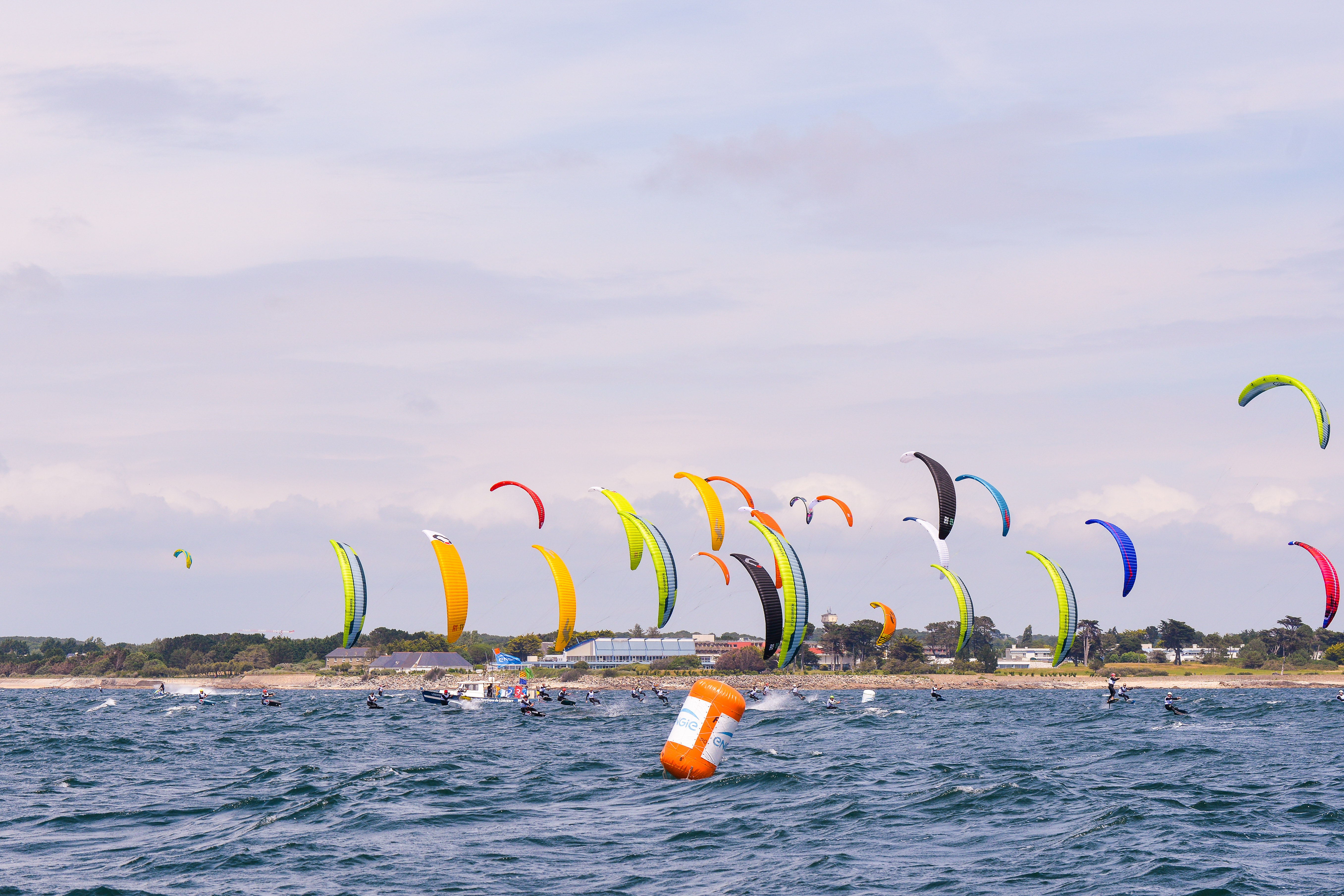 Vent de sud-ouest de 15 à 20 nœuds, soleil, concurrents nombreux : la 2e étape de l’ENGIE Kite Tour 2024 a débuté dans les meilleures conditions possibles ce vendredi sur la plage de Kerguelen à Larmor-Plage. Organisée par le Centre Nautique de Lorient avec le soutien des clubs de kiteboard locaux, l’étape réunit 42 concurrents en Kitefoil, 17 en Twin-Tip, 13 en planche directionnelle et 26 en wingfoil.