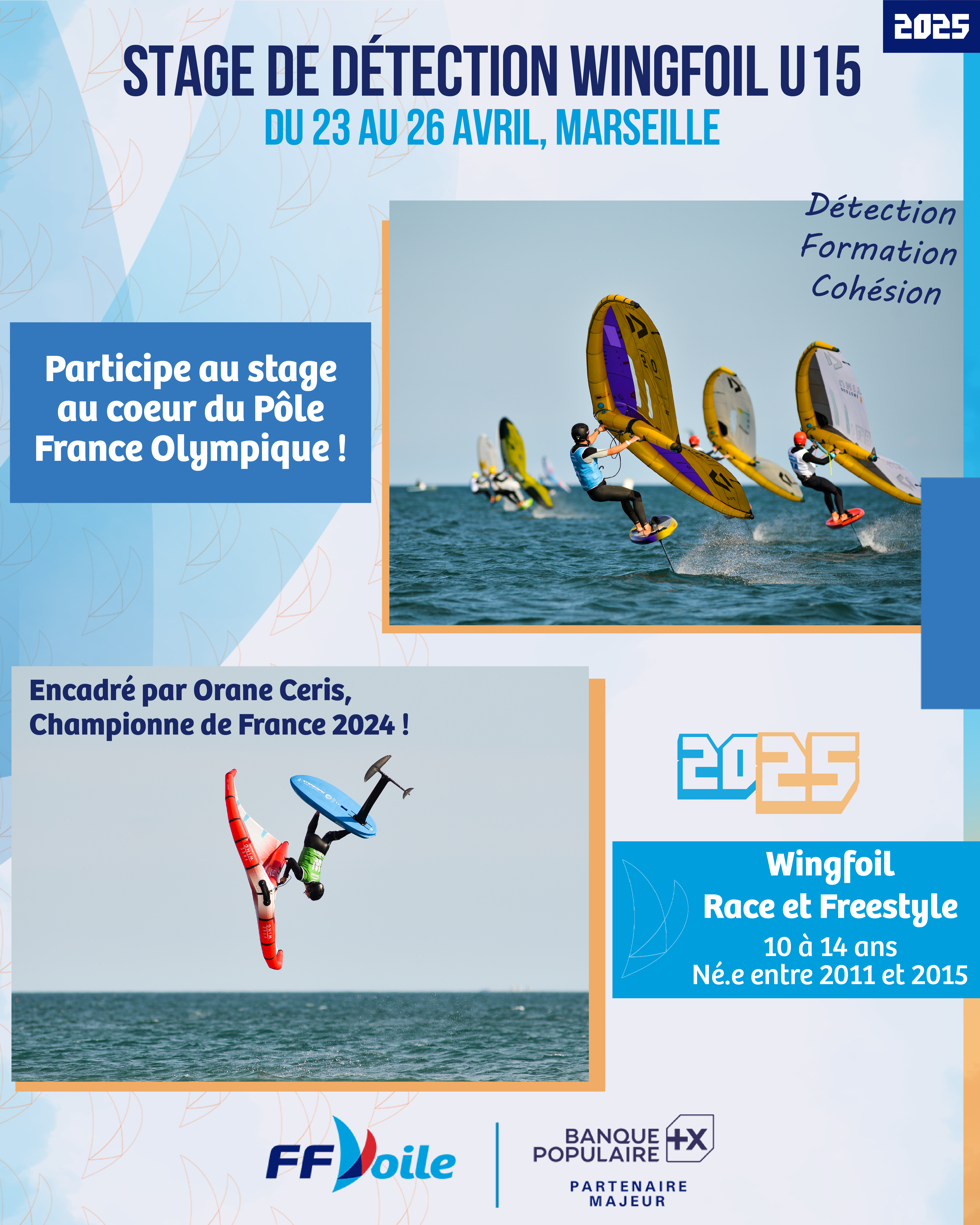 Un stage de détection en wingfoil est organisé pour les U15, du 23 au 26 avril, au Pôle France Olympique de Marseille, où se sont déroulés les Jeux Olympiques cet été. L'occasion pour les jeunes filles et les jeunes garçons de se réunir dans ce lieu mythique pour 4 jours de stage, encadré par Orane Ceris, entraîneur délégation jeune Wingfoil et Championne de France 2024 de la discipline. 8 places sont disponibles, alors inscrivez vous vite !